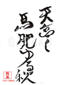 2014年11月27日 / 最終更新日 : 2017年5月11日 Katsumi Ito 2014 デザイン書道:作品026「天高く馬肥ゆる秋」【今日の書】「作品1578:清明」【昨日の書】「作品1577:鞦韆」 天高く馬肥ゆる秋【読み】 てんたかくうまこゆるあき 【意味】 空は澄み渡って晴れ、馬が食欲を増し、肥えてたくましくなる秋。【026】「天高く馬肥ゆる秋」 関連する作品デザイン書道:作品1109「夏の風邪は犬も食わぬ」デザイン書道:作品1103「鶴は千年 亀は万年」デザイン書道:作品1089「鯉の滝登り」故事ことわざ:作品1082「薬より養生」故事ことわざ:作品1057「民の声は神の声」デザイン書道:作品1027「縁あれば千里」 Tags: 2014, デザイン書道, 故事ことわざ