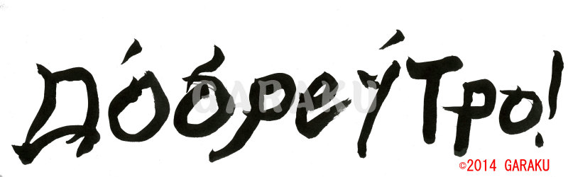 2014年11月28日 / 最終更新日 : 2017年5月11日 Katsumi Ito 2014 デザイン書道:作品047「Доброе утро!」【今日の書】「作品1578:清明」【昨日の書】「作品1577:鞦韆」 Доброе утро!【読み】 ドーブロエ ウートロ 【意味】 「おはようございます」 をロシア語で書きました。【047】 「Доброе утро!」 関連する作品デザイン書道:作品087「Желаю удачи!」デザイン書道:作品062「спасибо.」デザイン書道:作品129「愛及屋烏」デザイン書道:作品126「元旦」デザイン書道:作品125「新年の挨拶」デザイン書道:作品124「年末の挨拶」 Tags: 2014, デザイン書道, ロシア語
