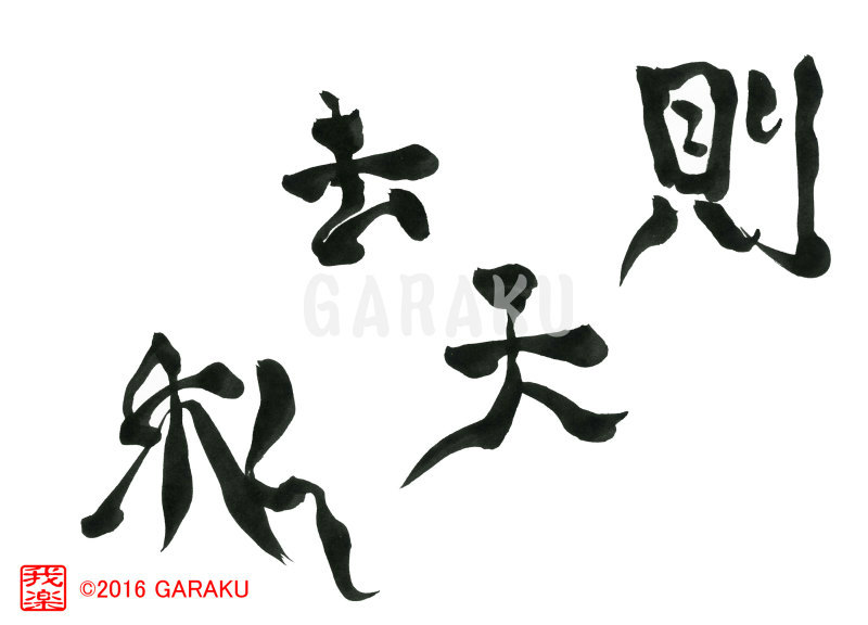 2016年6月24日 / 最終更新日 : 2017年5月3日 Katsumi Ito 2016 デザイン書道:作品1001「則天去私」【今日の書】「作品1578:清明」【昨日の書】「作品1577:鞦韆」 則天去私【読み】 そくてんきょし 【意味】 小さな私にとらわれず、身を天地自然にゆだねて生きて行くこと。 「則天」は天地自然の法則や普遍的な妥当性に従うこと。 「 去私」は私心を捨て去ること。 夏目漱石そうせきが晩年に理想とした境地を表した言葉で宗教的な悟りを意味するとも漱石の文学観とも解されている。【1001】「則天去私」 関連する作品デザイン書道:作品1389「笑門来福」デザイン書道:作品1387「風光明媚」デザイン書道:作品1384「夢幻泡影」デザイン書道:作品1382「唯一無二」デザイン書道:作品1377「勇気凛凛」デザイン書道:作品1371「山紫水明」 Tags: 2016, デザイン書道, 四文字熟語