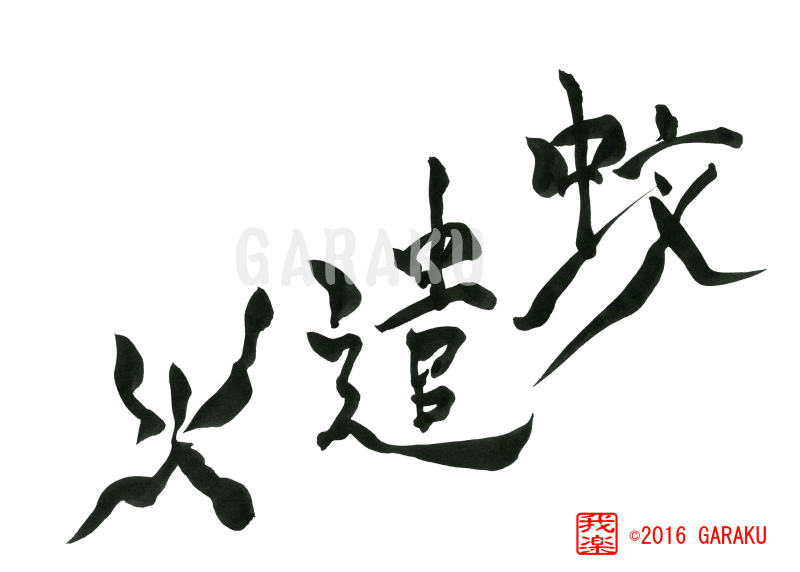 2016年7月29日 / 最終更新日 : 2017年5月4日 Katsumi Ito 三文字 デザイン書道:作品1069「蚊遣火」【今日の書】「作品1578:清明」【昨日の書】「作品1577:鞦韆」 蚊遣火【読み】 かやりび 【意味】 よもぎの葉、カヤ(榧)の木、杉や松の青葉などを火にくべて燻した煙で蚊を追い払う。 大正時代初期頃までの生活風習である。【1069】「蚊遣火」 関連する作品デザイン書道:作品1397「大晦日」デザイン書道:作品1376「銀世界」デザイン書道:作品1370「居酒屋」デザイン書道:作品1327「歌舞伎」デザイン書道:作品1323「御朱印」デザイン書道:作品1276「松竹梅」 Tags: 2016, デザイン書道, 三文字