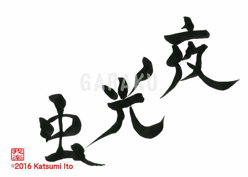2016年10月10日 / 最終更新日 : 2017年5月5日 Katsumi Ito 三文字 デザイン書道:作品1144「夜光虫」【今日の書】「作品1578:清明」【昨日の書】「作品1577:鞦韆」 夜光虫【読み】 やこうちゅう 【意味】 ヤコウチュウ(夜光虫、Noctiluca scintillans)は海洋性のプランクトン。 大発生すると夜に光り輝いて見える事からこの名(ラテン語で noctis ‘夜’+lucens ‘光る’)が付いた 昼には赤潮として姿を見せる。【1144】「夜光虫」 関連する作品デザイン書道:作品1397「大晦日」デザイン書道:作品1376「銀世界」デザイン書道:作品1370「居酒屋」デザイン書道:作品1327「歌舞伎」デザイン書道:作品1323「御朱印」デザイン書道:作品1276「松竹梅」 Tags: 2016, デザイン書道, 三文字