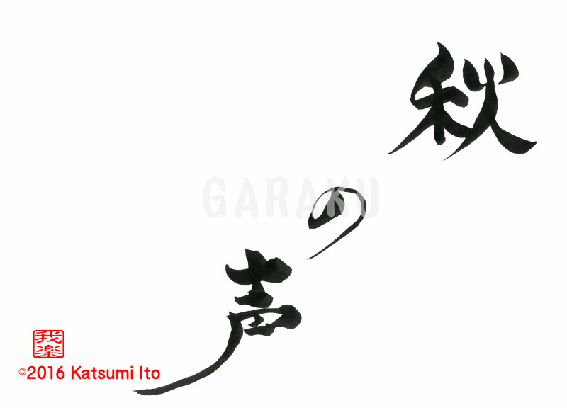 2016年10月10日 / 最終更新日 : 2017年5月5日 Katsumi Ito 2016 デザイン書道:作品1146「秋の声」【今日の書】「作品1578:清明」【昨日の書】「作品1577:鞦韆」 秋の声【読み】 あきのこえ 【意味】 季語: 物音がさやかに聞こえること。 自然の音や物音などのばかりでなく、心の中や秋の気配もまた秋の声である。【1146】「秋の声」 関連する作品デザイン書道:作品1231「星の入り東風」デザイン書道:作品1156「風の盆」デザイン書道:作品862「青桐」デザイン書道:作品827「白南風」デザイン書道:作品813「木々の緑もようやく深くなり」デザイン書道:作品812「長雨の候」 Tags: 2016, デザイン書道, 季語