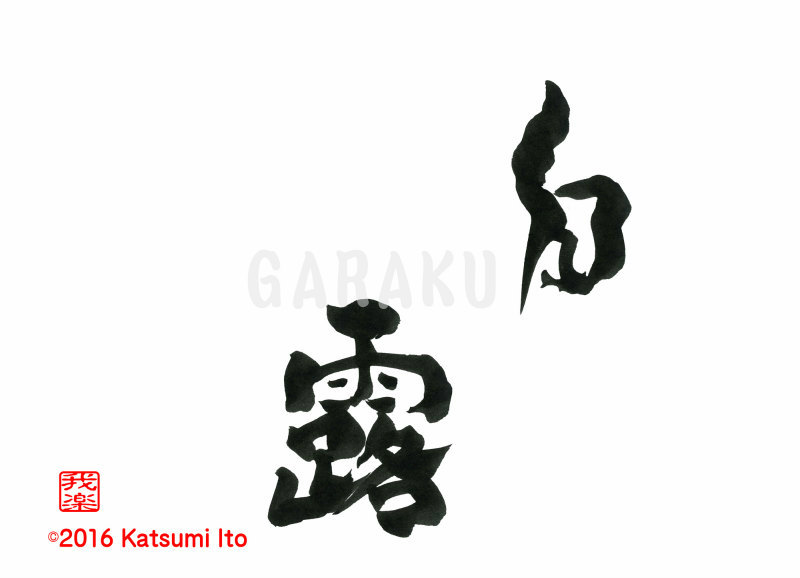2016年10月12日 / 最終更新日 : 2017年5月6日 Katsumi Ito 二文字 デザイン書道:作品1163「白露」【今日の書】「作品1578:清明」【昨日の書】「作品1577:鞦韆」 白露【読み】 はくろ 【意味】 しらつゆ 二十四気の一つ。 秋分の十五日前、陽暦九月八日ごろで、このころから秋気が進んで露を結ぶとされる。【1163】「白露」 関連する作品デザイン書道:作品625「如月」デザイン書道:作品1393「逸品」デザイン書道:作品1378「寒椿」デザイン書道:作品1374「不動」デザイン書道:作品1369「蝋梅」デザイン書道:作品1359「阿吽」 Tags: 2016, デザイン書道, ニ文字