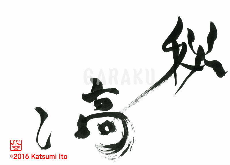2016年10月13日 / 最終更新日 : 2017年5月6日 Katsumi Ito 2016 デザイン書道:作品1177「秋高し」【今日の書】「作品1578:清明」【昨日の書】「作品1577:鞦韆」 秋高し【読み】 あきたかし 【意味】 秋の空の、澄みわたって高く感じられるさま。 天高し。【1177】「秋高し」 関連する作品デザイン書道:作品625「如月」デザイン書道:作品1400「除夜の鐘」デザイン書道:作品1399「年越し蕎麦」デザイン書道:作品1398「鏡餅」デザイン書道:作品1397「大晦日」デザイン書道:作品1396「灯す」 Tags: 2016, デザイン書道
