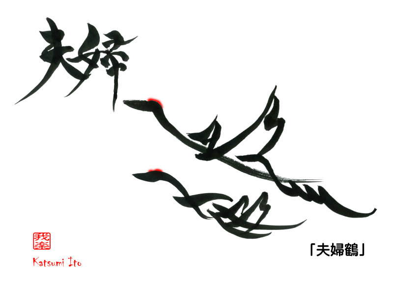 2016年11月22日 / 最終更新日 : 2017年5月7日 Katsumi Ito 三文字 デザイン書道:作品1229「夫婦鶴」【今日の書】「作品1578:清明」【昨日の書】「作品1577:鞦韆」 夫婦鶴【読み】 めおとつる 【意味】 古来より「鶴は千年」といわれ「長寿を象徴する吉祥の鳥」として、 また夫婦仲が大変良く一生を連れ添うことから「夫婦鶴=めおとづる」といわれて「仲良きことの象徴」の鳥として尊ばれてきました。【1229】「夫婦鶴」 関連する作品デザイン書道:作品1113「夫婦鶴」デザイン書道:作品739「仏法僧」デザイン書道:作品617「浮寝鳥」デザイン書道:作品1397「大晦日」デザイン書道:作品1376「銀世界」デザイン書道:作品1370「居酒屋」 Tags: 2016, デザイン書道, 三文字, 鳥