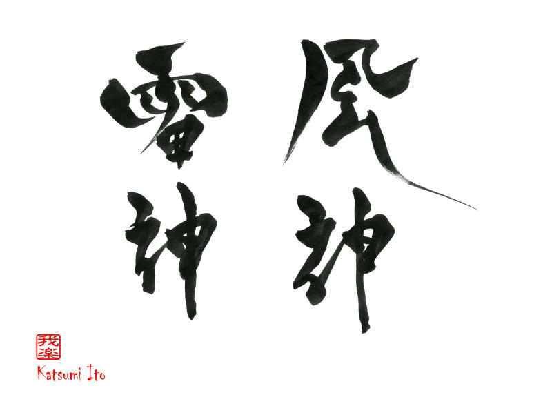 2016年12月18日 / 最終更新日 : 2017年5月8日 Katsumi Ito 2016 デザイン書道:作品1319「雷神・風神」【今日の書】「作品1578:清明」【昨日の書】「作品1577:鞦韆」 雷神・風神【読み】 らいじん・ふうじん 【意味】 風袋から風を吹き出し、下界に風雨をもたらす風神と、太鼓を叩いて雷鳴と稲妻をおこす雷神の活動の姿を描写する絵画。 俵屋宗達筆の屏風画が有名で、琳派の絵師をはじめ、多くの画家によって作られた模作や模写が多数ある。 「風神雷神図」 出典:ウィキペディア【1319】「雷神・風神」 関連する作品デザイン書道:作品625「如月」デザイン書道:作品1400「除夜の鐘」デザイン書道:作品1399「年越し蕎麦」デザイン書道:作品1398「鏡餅」デザイン書道:作品1397「大晦日」デザイン書道:作品1396「灯す」 Tags: 2016, デザイン書道