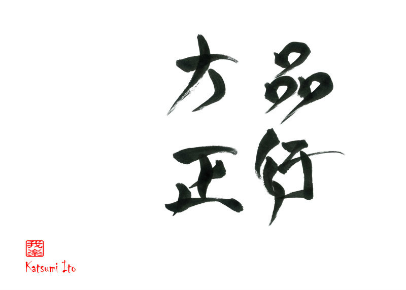 2016年12月18日 / 最終更新日 : 2017年5月8日 Katsumi Ito 2016 デザイン書道:作品1322「品行方正」【今日の書】「作品1578:清明」【昨日の書】「作品1577:鞦韆」 品行方正【読み】 ひんこうほうせい 【意味】 心や行いが正しく立派なさま。 「品行」は行い・振る舞い・行状のこと。 「方正」は心や行いが、正しくきちんとしているさま。 出典:goo辞書【1322】「品行方正」 関連する作品デザイン書道:作品1389「笑門来福」デザイン書道:作品1387「風光明媚」デザイン書道:作品1384「夢幻泡影」デザイン書道:作品1382「唯一無二」デザイン書道:作品1377「勇気凛凛」デザイン書道:作品1371「山紫水明」 Tags: 2016, デザイン書道, 四文字熟語