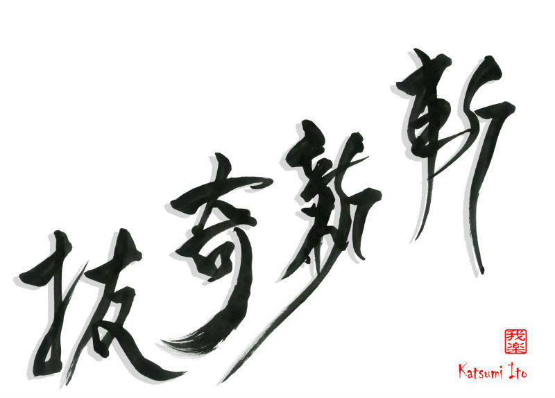 2016年12月27日 / 最終更新日 : 2017年5月9日 Katsumi Ito 2016 デザイン書道:作品1368「斬新奇抜」【今日の書】「作品1578:清明」【昨日の書】「作品1577:鞦韆」 斬新奇抜【読み】 ざんしんきばつ 【意味】 物事の着想が独自で、それまでに類をみないほど新しいさま。 それまでにないほど新しく、思いもよらないほど変わっているさま。【1368】「斬新奇抜」 関連する作品デザイン書道:作品1389「笑門来福」デザイン書道:作品1387「風光明媚」デザイン書道:作品1384「夢幻泡影」デザイン書道:作品1382「唯一無二」デザイン書道:作品1377「勇気凛凛」デザイン書道:作品1371「山紫水明」 Tags: 2016, デザイン書道, 四文字熟語