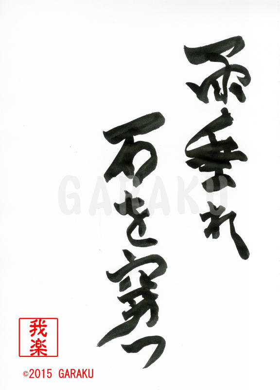 2015年2月1日 / 最終更新日 : 2017年5月12日 Katsumi Ito 2015 デザイン書道:作品178「雨垂れ石を穿つ」【今日の書】「作品1578:清明」【昨日の書】「作品1577:鞦韆」 雨垂れ石を穿つ【読み】 あまだれいしをうがつ 【意味】 雨垂れが長い間には石にも穴をあけてしまうように非力でも根気よく続けてやれば、ついには成功するということ。【178】「雨垂れ石を穿つ」 関連する作品デザイン書道:作品509「神無月」デザイン書道:作品457「長月」デザイン書道:作品456「夏」デザイン書道:作品455「涼」デザイン書道:作品453「蛙」デザイン書道:作品452「夕凪」 Tags: 2015, デザイン書道, 故事ことわざ