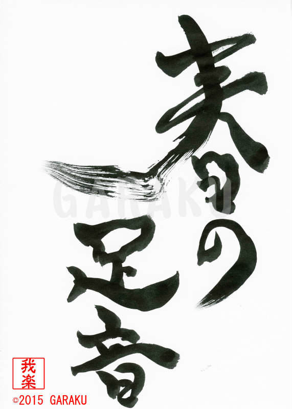 2015年2月12日 / 最終更新日 : 2017年5月12日 Katsumi Ito 2015 デザイン書道:作品208「春の足音」【今日の書】「作品1578:清明」【昨日の書】「作品1577:鞦韆」 春の足音【読み】 はるのあしおと 【意味】 春の足音を英語に訳すと 訳語「footsteps of spring」【208】「春の足音」 関連する作品デザイン書道:作品509「神無月」デザイン書道:作品457「長月」デザイン書道:作品456「夏」デザイン書道:作品455「涼」デザイン書道:作品453「蛙」デザイン書道:作品452「夕凪」 Tags: 2015, デザイン書道