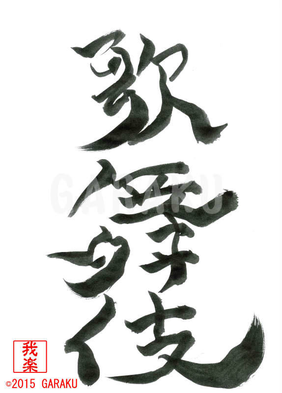 2015年2月18日 / 最終更新日 : 2017年5月12日 Katsumi Ito 三文字 デザイン書道:作品224「歌舞伎」歌舞伎【読み】 かぶき 【意味】 由来は、「傾く」(かたむく)の古語「傾く」(かぶく)の連用形を名詞化した「かぶき」といわれる。 戦国時代の終わり頃から江戸時代の初頭にかけて京や江戸で流行した、 派手な衣装や一風変わった異形を好んだり、常軌を逸脱した行動に走ることを指した語で、特にそうした者たちのことを「かぶき者」とも言った。【224】「歌舞伎」 関連する作品デザイン書道:作品372「水無月」デザイン書道:作品594「山茶花」デザイン書道:作品577「零余子」デザイン書道:作品558「勿忘草」デザイン書道:作品547「菊日和」デザイン書道:作品546「星月夜」 Tags: 2015, デザイン書道, 三文字