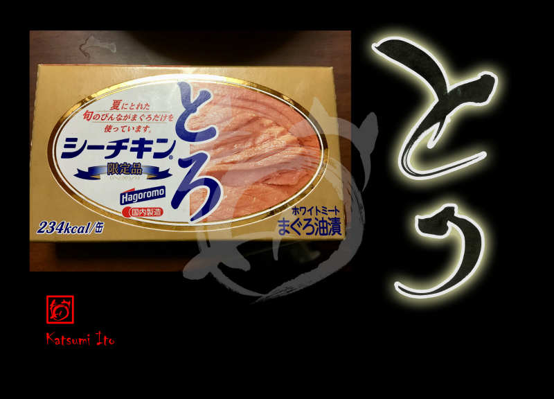 2018年4月23日 / 最終更新日 : 2018年4月23日 Katsumi Ito 食品 デザイン書道:作品2324「とろ」とろ【読み】 とろ 【解説】 びんながまぐろのとろ肉の部分だけを使用し、一缶ずつ丁寧に詰めたまぐろ油漬けです。 本品はびんながまぐろのトロの部分だけを使用しておりますので、一匹の魚体からごく少量の原料しかとれないこだわりの逸品です。 【感想】 「はごろも シーチキンとろ(限定品)」500円を実食! 「とろ」感はない・・・(-_-) ハラミだと思うが、普通のシーチキンで十分満足(庶民なんで:笑) ※好きな食べ方はシーチキンに醤油を垂らし混ぜ、ご飯に乗せて食べる。【2324】「とろ」 関連する作品デザイン書道:作品3157「梅干」デザイン書道:作品3092「笋」デザイン書道:作品3091「粉」デザイン書道:作品3007「新海苔」デザイン書道:作品2977「漬物」デザイン書道:作品2970「冷凍食品」 Tags: 食品