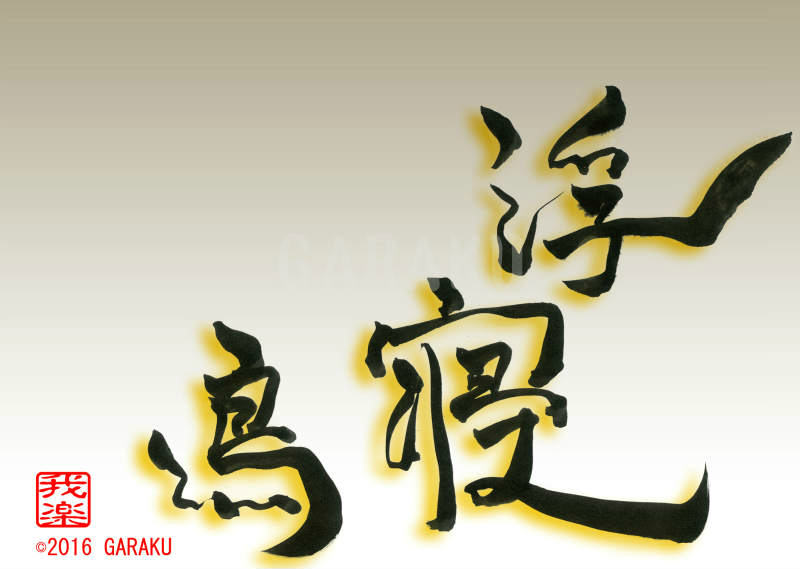 2016年1月18日 / 最終更新日 : 2017年5月14日 Katsumi Ito 三文字 デザイン書道:作品617「浮寝鳥」【今日の書】「作品1578:清明」【昨日の書】「作品1577:鞦韆」 浮寝鳥【読み】 うきねとり 【意味】 毎年越冬のため、毎年日本に渡ってきて川や湖沼で一冬を過ごす 水鳥の群れ。 鴨・雁・鳰・鴛鴦・白鳥などが、水面に浮かんで眠 るさまをいう。【617】「浮寝鳥」 関連する作品デザイン書道:作品1229「夫婦鶴」デザイン書道:作品1113「夫婦鶴」デザイン書道:作品739「仏法僧」デザイン書道:作品1397「大晦日」デザイン書道:作品1376「銀世界」デザイン書道:作品1370「居酒屋」 Tags: 2016, デザイン書道, 三文字, 鳥