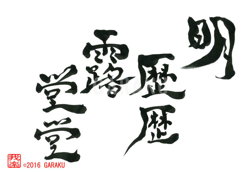 2016年5月31日 / 最終更新日 : 2017年5月20日 Katsumi Ito 禅語 デザイン書道:作品704「明歴歴露堂堂」【今日の書】「作品1578:清明」【昨日の書】「作品1577:鞦韆」 明歴歴露堂堂【読み】 めいれきれきろどうどう 【意味】 禅語:心の目をいっぱいに開いて見よ【704】「明歴歴露堂堂」 関連する作品デザイン書道:作品1026「鳥啼山更幽」デザイン書道:作品1023「生我者父母 成我者朋友」デザイン書道:作品1021「死ぬ時節には死ぬがよく候」デザイン書道:作品1018「一切有為法 如夢幻泡影」デザイン書道:作品1016「相送当門有脩竹 為君葉葉起清風」デザイン書道:作品1008「竹影、階を掃って塵動せず 月、潭底を穿つも水に痕無し」 Tags: 禅語