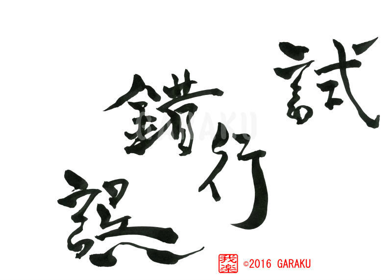 2016年6月3日 / 最終更新日 : 2017年5月14日 Katsumi Ito 2016 デザイン書道:作品725「試行錯誤」【今日の書】「作品1578:清明」【昨日の書】「作品1577:鞦韆」 試行錯誤【読み】 しこうさくご 【意味】 新しい物事を、いろいろ試して失敗しつつ完成に近づけてゆくこと。 英語でtrial and errorという。【725】「試行錯誤」 関連する作品デザイン書道:作品1389「笑門来福」デザイン書道:作品1387「風光明媚」デザイン書道:作品1384「夢幻泡影」デザイン書道:作品1382「唯一無二」デザイン書道:作品1377「勇気凛凛」デザイン書道:作品1371「山紫水明」 Tags: 2016, デザイン書道, 四文字熟語