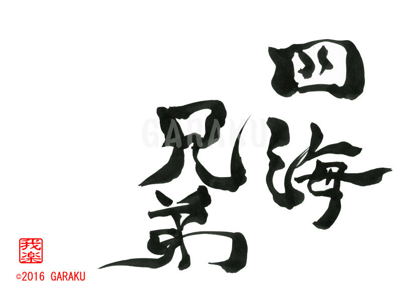 2016年6月3日 / 最終更新日 : 2017年5月14日 Katsumi Ito 2016 デザイン書道:作品733「四海兄弟」【今日の書】「作品1578:清明」【昨日の書】「作品1577:鞦韆」 四海兄弟【読み】 しかいけいてい 【意味】 世の中の人はすべて兄弟のように仲よく、愛し合わなければならないということ。【733】「四海兄弟」 関連する作品デザイン書道:作品1389「笑門来福」デザイン書道:作品1387「風光明媚」デザイン書道:作品1384「夢幻泡影」デザイン書道:作品1382「唯一無二」デザイン書道:作品1377「勇気凛凛」デザイン書道:作品1371「山紫水明」 Tags: 2016, デザイン書道, 四文字熟語