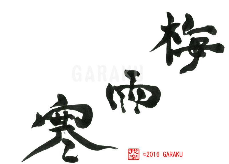 2016年6月6日 / 最終更新日 : 2017年5月14日 Katsumi Ito 三文字 デザイン書道:作品785「梅雨寒」【今日の書】「作品1578:清明」【昨日の書】「作品1577:鞦韆」 梅雨寒【読み】 つゆざむ 【意味】 梅雨の時期に時々訪れる寒さ。 梅雨冷え。【785】「梅雨寒」 関連する作品デザイン書道:作品1397「大晦日」デザイン書道:作品1376「銀世界」デザイン書道:作品1370「居酒屋」デザイン書道:作品1327「歌舞伎」デザイン書道:作品1323「御朱印」デザイン書道:作品1276「松竹梅」 Tags: 2016, デザイン書道, 三文字