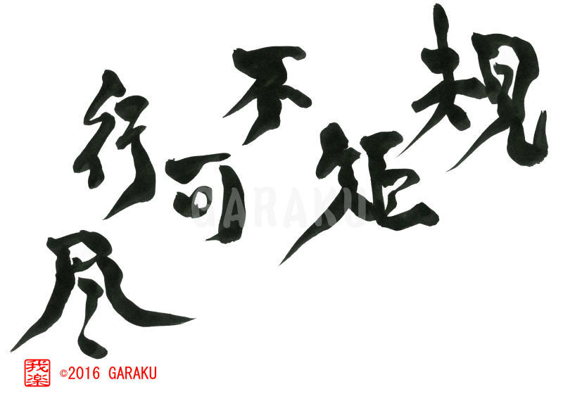 2016年6月6日 / 最終更新日 : 2017年5月14日 Katsumi Ito 2016 デザイン書道:作品786「規矩不可行尽」【今日の書】「作品1578:清明」【昨日の書】「作品1577:鞦韆」 規矩不可行尽【読み】 きくおこないつくすべからず 【意味】 禅語:規則やマニュアルでしばるのもほどほどに。【786】「規矩不可行尽」 関連する作品デザイン書道:作品999「父の日」デザイン書道:作品983「流水、無心にして落花を送る」デザイン書道:作品963「木鶏鳴子夜」デザイン書道:作品959「把手共行」デザイン書道:作品955「名利共に休す」デザイン書道:作品947「水到れば渠成る」 Tags: 2016, デザイン書道, 禅語