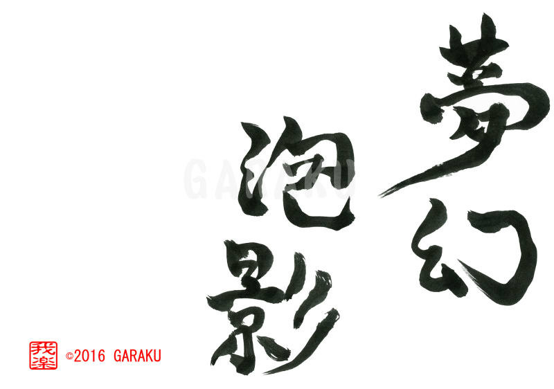 2016年6月7日 / 最終更新日 : 2017年4月30日 Katsumi Ito 2016 デザイン書道:作品801「夢幻泡影」【今日の書】「作品1578:清明」【昨日の書】「作品1577:鞦韆」 夢幻泡影【読み】 むげんほうよう 【意味】 人生や世の中がはかないものであることのたとえ。 「夢」「幻」「泡」「影」いずれも実態がなく、はかないもののたとえ。【801】「夢幻泡影」 関連する作品デザイン書道:作品1389「笑門来福」デザイン書道:作品1387「風光明媚」デザイン書道:作品1384「夢幻泡影」デザイン書道:作品1382「唯一無二」デザイン書道:作品1377「勇気凛凛」デザイン書道:作品1371「山紫水明」 Tags: 2016, デザイン書道, 四文字熟語