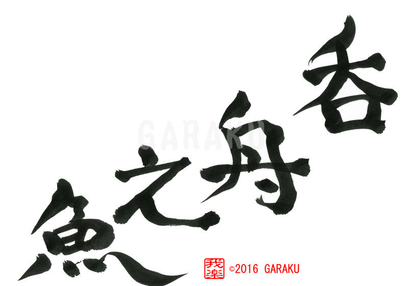 2016年6月9日 / 最終更新日 : 2017年4月30日 Katsumi Ito 2016 デザイン書道:作品838「呑舟之魚」【今日の書】「作品1578:清明」【昨日の書】「作品1577:鞦韆」 呑舟之魚【読み】 どんしゅうのうお 【意味】 常人をはるかに超えた才能をもつ大物。 大人物。 善人・悪人ともに用いる。 「呑舟」は舟を飲み込むこと。 舟を飲み込んでしまうほどの大きな魚の意味。【838】「呑舟之魚」 関連する作品デザイン書道:作品1389「笑門来福」デザイン書道:作品1387「風光明媚」デザイン書道:作品1384「夢幻泡影」デザイン書道:作品1382「唯一無二」デザイン書道:作品1377「勇気凛凛」デザイン書道:作品1371「山紫水明」 Tags: 2016, デザイン書道, 四文字熟語