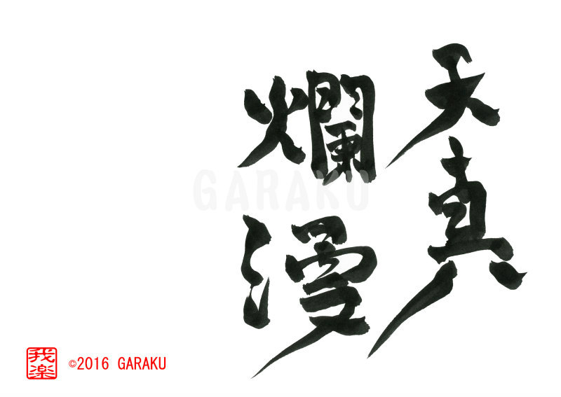 2016年6月11日 / 最終更新日 : 2017年5月1日 Katsumi Ito 2016 デザイン書道:作品870「天真爛漫」【今日の書】「作品1578:清明」【昨日の書】「作品1577:鞦韆」 天真爛漫【読み】 てんしんらんまん 【意味】 飾らず自然のままの姿があふれ出ているさま。 生まれつきの素直な心そのままで、明るく純真で無邪気なさま。【870】「天真爛漫」 関連する作品デザイン書道:作品1389「笑門来福」デザイン書道:作品1387「風光明媚」デザイン書道:作品1384「夢幻泡影」デザイン書道:作品1382「唯一無二」デザイン書道:作品1377「勇気凛凛」デザイン書道:作品1371「山紫水明」 Tags: 2016, デザイン書道, 四文字熟語