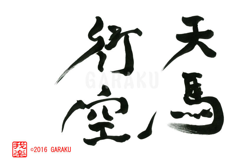 2016年6月13日 / 最終更新日 : 2017年5月1日 Katsumi Ito 2016 デザイン書道:作品909「天馬行空」【今日の書】「作品1578:清明」【昨日の書】「作品1577:鞦韆」 天馬行空【読み】 てんばこうくう 【意味】 自由奔放で伸び伸びしている様。 主に文章、思想、行動、人柄に用いる。 天馬が遮る物のない大空を勢いよく走る姿から。【909】「天馬行空」 関連する作品デザイン書道:作品1389「笑門来福」デザイン書道:作品1387「風光明媚」デザイン書道:作品1384「夢幻泡影」デザイン書道:作品1382「唯一無二」デザイン書道:作品1377「勇気凛凛」デザイン書道:作品1371「山紫水明」 Tags: 2016, デザイン書道, 四文字熟語