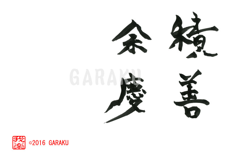 2016年6月18日 / 最終更新日 : 2017年5月2日 Katsumi Ito 2016 デザイン書道:作品962「積善余慶」【今日の書】「作品1578:清明」【昨日の書】「作品1577:鞦韆」 積善余慶【読み】 せきぜんよけい 【意味】 善い行いを積み重ねた結果として必ず思いもかけないよいことが起こること。【962】「積善余慶」 関連する作品デザイン書道:作品1389「笑門来福」デザイン書道:作品1387「風光明媚」デザイン書道:作品1384「夢幻泡影」デザイン書道:作品1382「唯一無二」デザイン書道:作品1377「勇気凛凛」デザイン書道:作品1371「山紫水明」 Tags: 2016, デザイン書道, 四文字熟語
