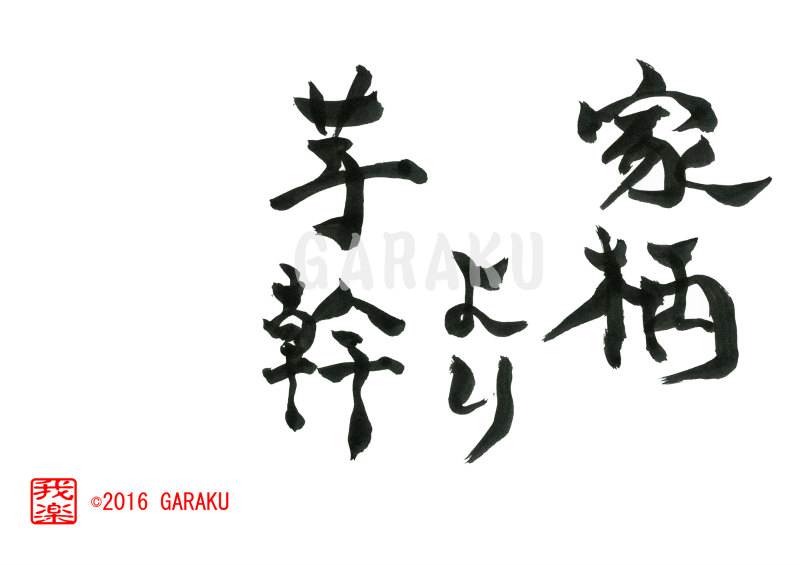 2016年6月18日 / 最終更新日 : 2017年5月2日 Katsumi Ito 2016 デザイン書道:作品973「家柄より芋幹」【今日の書】「作品1578:清明」【昨日の書】「作品1577:鞦韆」 家柄より芋幹【読み】 いえがらよりいもがら 【意味】 家柄の良さよりも食用になる芋幹のほうがましである。 勢力のない名ばかりの名家をあざけて言った言葉。【973】「家柄より芋幹」 関連する作品デザイン書道:作品1109「夏の風邪は犬も食わぬ」デザイン書道:作品1103「鶴は千年 亀は万年」デザイン書道:作品1089「鯉の滝登り」故事ことわざ:作品1082「薬より養生」故事ことわざ:作品1057「民の声は神の声」デザイン書道:作品1027「縁あれば千里」 Tags: 2016, デザイン書道, 故事ことわざ