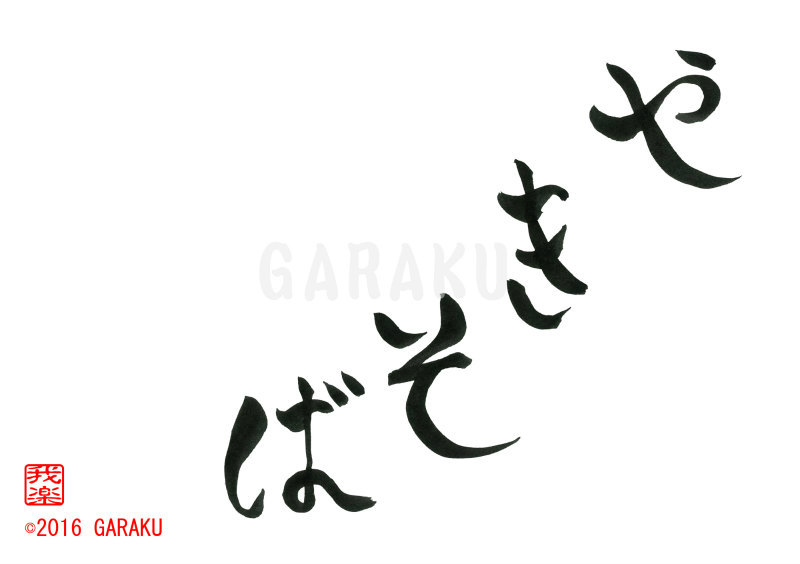 2016年6月19日 / 最終更新日 : 2017年5月2日 Katsumi Ito 2016 デザイン書道:作品992「やきそば」【今日の書】「作品1578:清明」【昨日の書】「作品1577:鞦韆」 やきそば【読み】 やきそば 【意味】 蒸した中華麺を魚介・肉・野菜などの具と共に油でいためて味付けした料理。 炒麺(チャオメン)。 また麺を油で揚げてあんかけた料理。【992】「やきそば」 関連する作品デザイン書道:作品1395「宴」デザイン書道:作品1394「えびせんべい」デザイン書道:作品1380「ほっこり」デザイン書道:作品1366「たおやか」デザイン書道:作品1260「ならい」デザイン書道:作品1119「おもやいで」 Tags: 2016, ひらがな